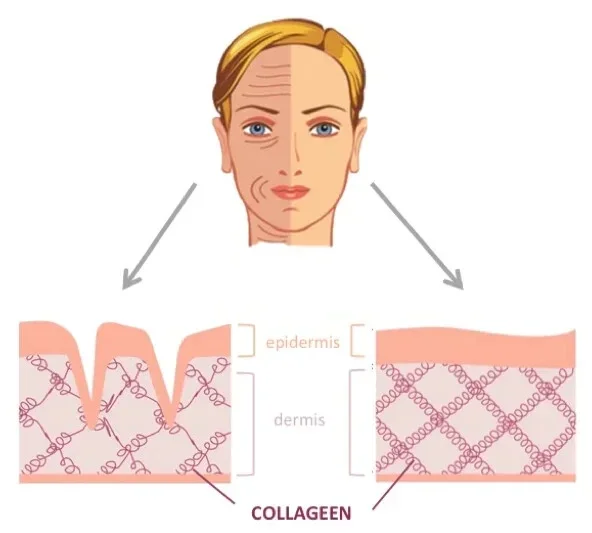 Collageen wordt onder andere aangemaakt in de huid. Dit is een proces dat geleidelijk afneemt naarmate je ouder word. Vanaf eind twintig, begin dertig begint je huid ongeveer 1% collageen per jaar te verliezen. Daarom is de huid van ouderen ook slapper dan die van jongere mensen. Ook externe factoren beïnvloeden de afbraak van collageenvezels in de huid zoals; roken, stress maar ook bepaalde voeding.